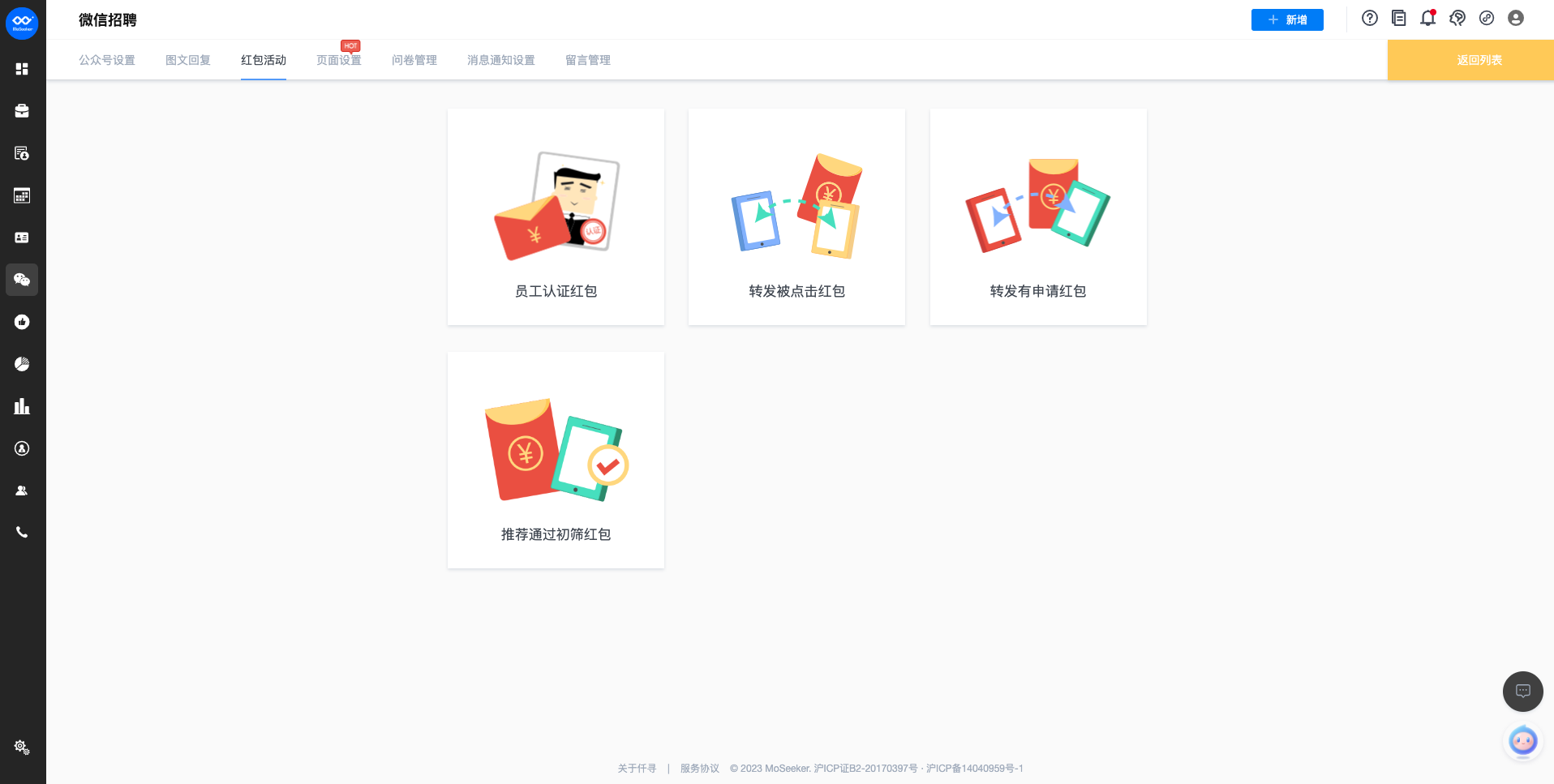功能包括:员工认证红包、转发被点击红包、转发有申请红包、推荐通过初筛红包