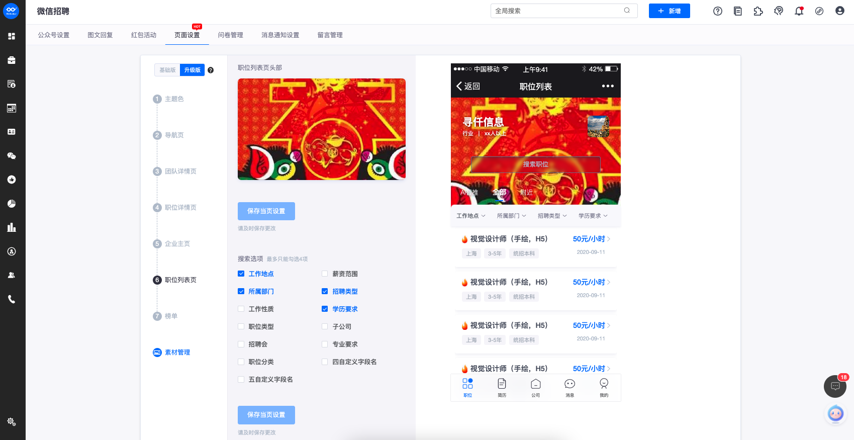 通过搭建企业微信招聘品牌门户,仟寻提供自定义微信门户搭建,用户可以在仟寻系统内完成微信公众号维护与页面搭建,包括菜单维护、图文回复、红包活动、问卷管理与消息管理等整套企业微信招聘门户的搭建与方案,同时提供多种模版满足用户使用;